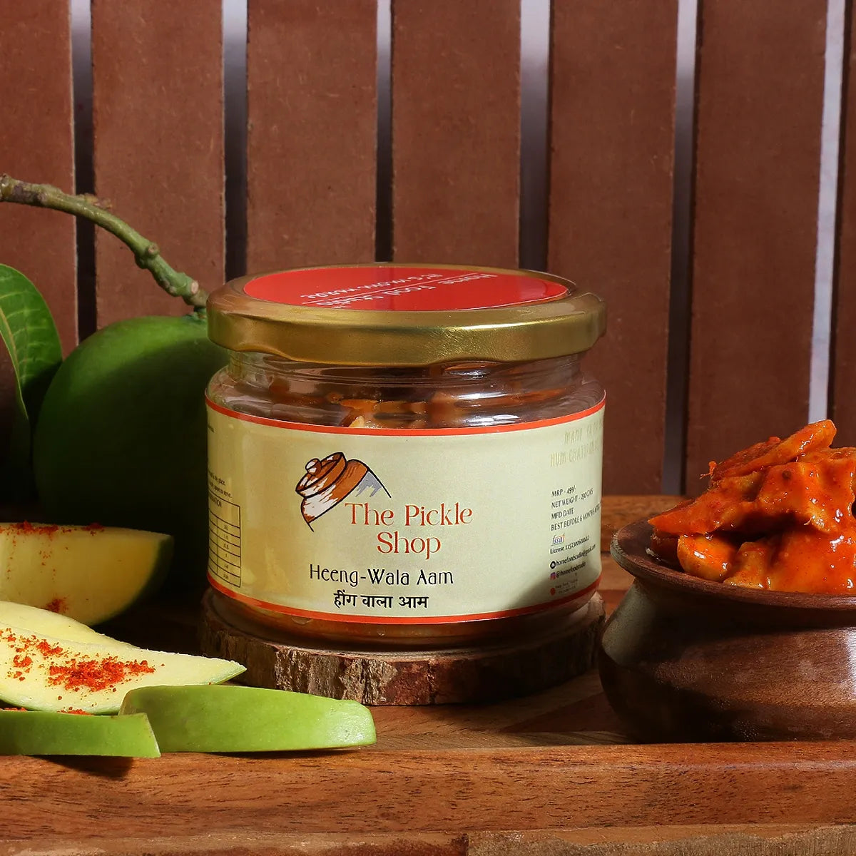 Our Heeng wala Aam is a delicious and tangy mango pickle infused with the flavor of asafoetida, prepared oil-free. A unique accompaniment to any meal.